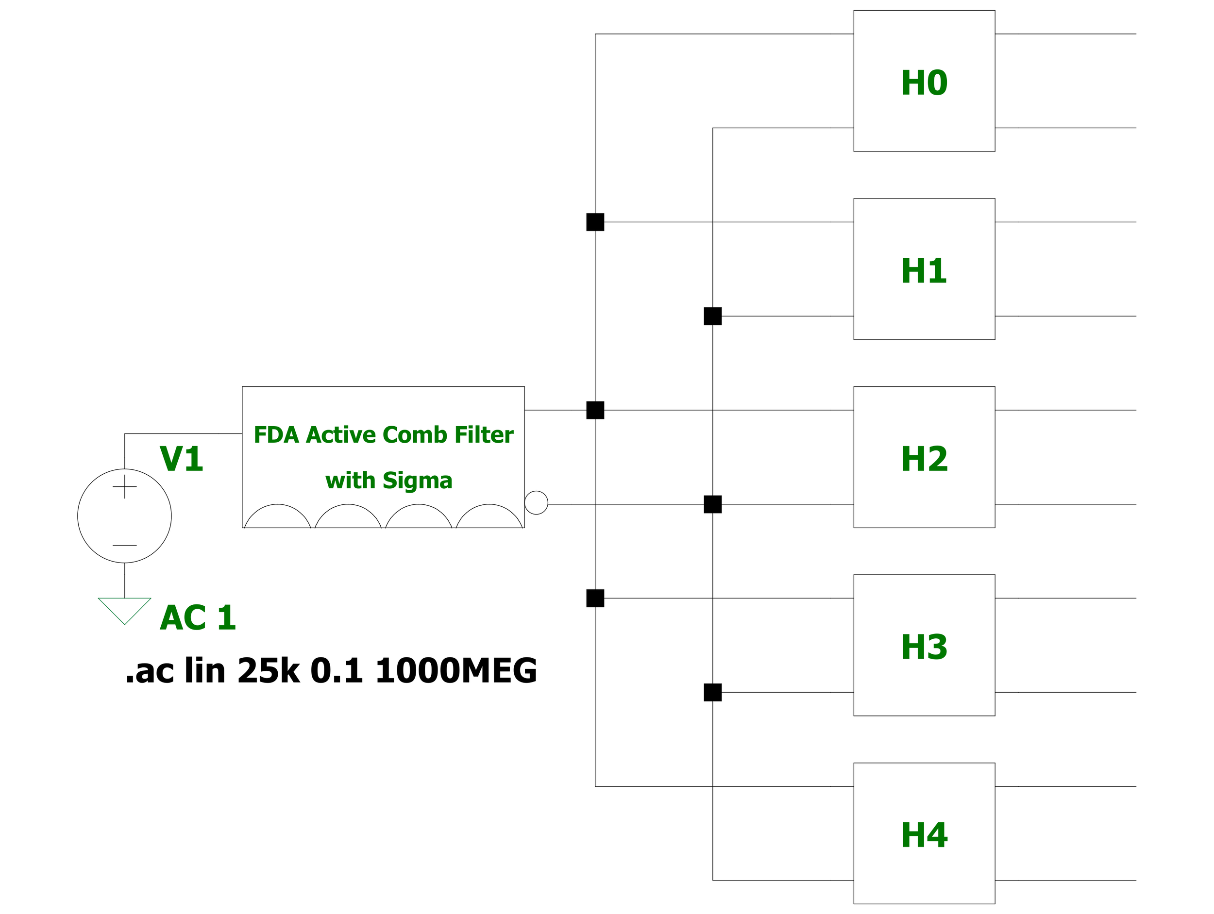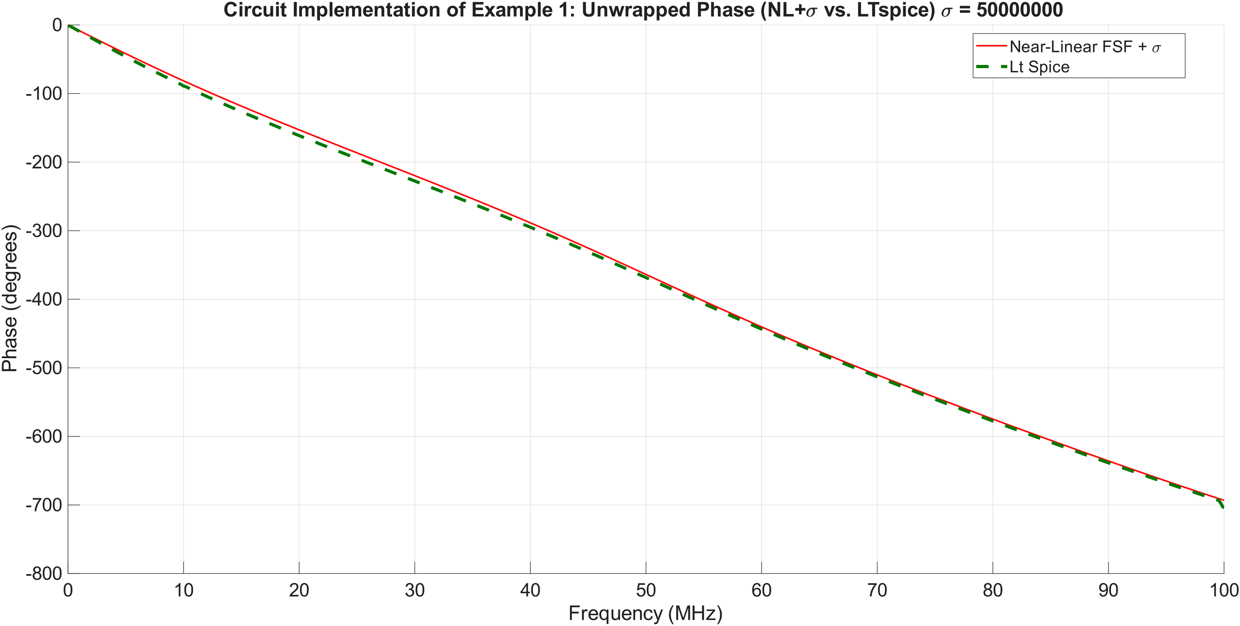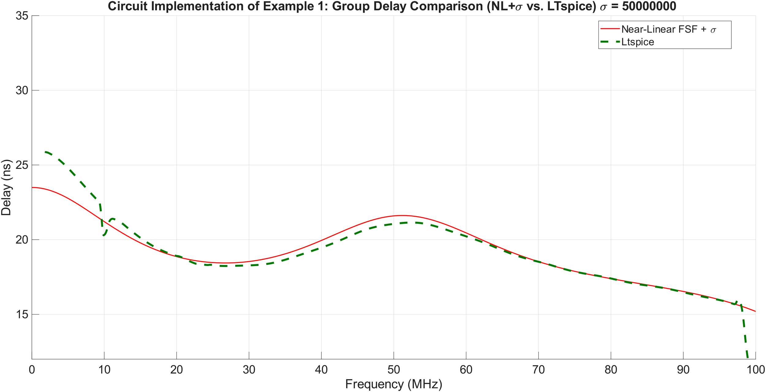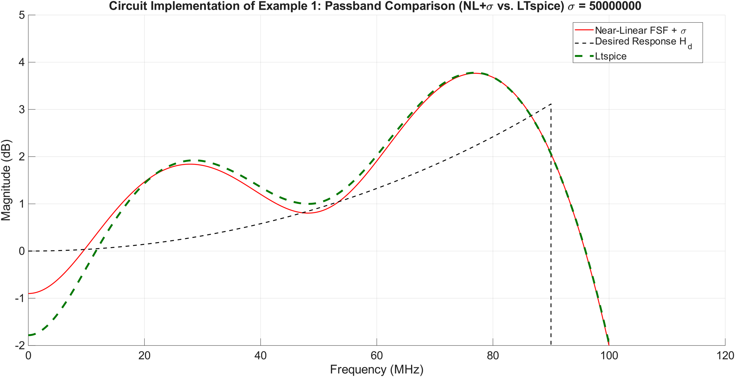 Several examples demonstrate that the optimization method is effective in designing a NL-FSF. These examples are implemented using component-level SPICE simulations. The comb filter is implemented using a delay line with a set delay period and combining the delayed signal with the original signal through a difference amplifier and then through a fully differential active biquad. The resonators are also implemented using fully differential active biquads. The resulting SPICE simulations closely match the MATLAB models, demonstrating the feasibility of the NL-FSF design method.